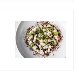Finas fatias de polvo coccionado em baixa temperatura, vinagrete de shisso, terra de umeboshi, azeite extra virgem