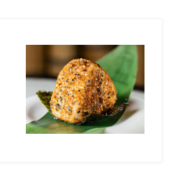 Bolinho de arroz grelhado no carvão, recheado de camarão e envolto em furikake de camarao