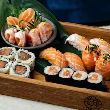 2 sashimis de salmao, 2 sashimis de barriga de salmao, 2 sashimis de salmao maçaricado, 2 nigiris de salmao, 2 nigiris de barriga de salmao, 2 dyo de salmao, 4 uramaki de salmao, 4 hosomaki de salmao.