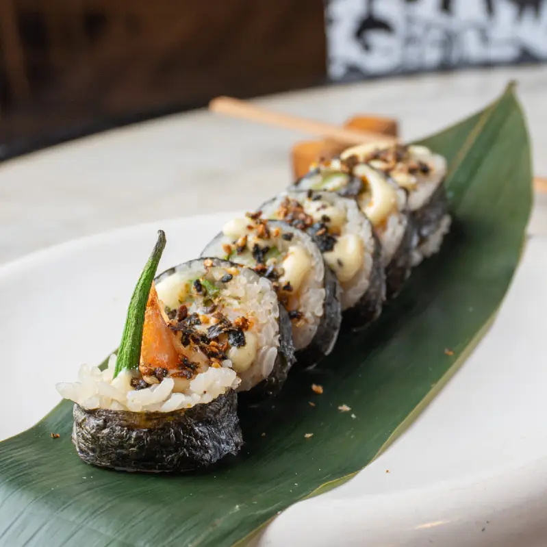 Tempura de camarão, quiabo grelhado, mayo de limão cravo, furikake de camarão
