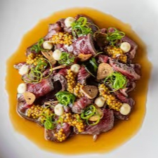 Denver de wagyu selado superficialmente, molho cítrico, chips de alho, semente de mostarda