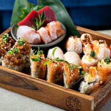 2 Sashimis de atum, 2 sashimis de barriga de salmaõ, 2 Sashimis de pescados maturados do dia, 2 nigiris de vieira trufada, 2 nigiris de camarão furikake, 2 dyo codorna, 4 uramaki spicy tuna, 4 uramaki ebi ten.