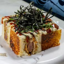 Shokupan (pão de leite japonês), copa lombo empanado, picles de abacaxi, maionese de alga e ketchup de gochujang levemente picante, finalizado com broto de coentro.