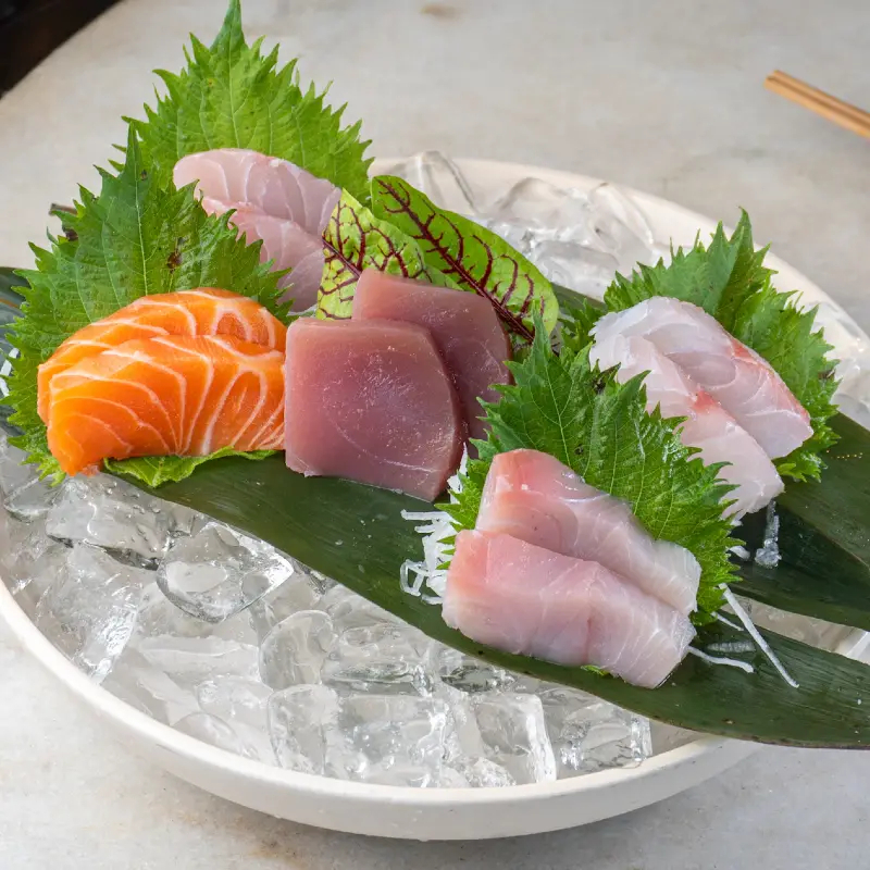 2 Sashimis de atum, 2 Sashimis de salmão, 2 Sashimis de pescados maturado branco do dia, 2 Nigiris de salmão, 2 Nigiris de atum, 2 nigiris de pescados maturados do dia, 4 uramaki salmão, 4 hosomaki atum.
