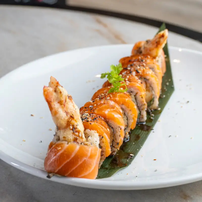 Enrolado com arroz por fora, recheado com tempura de camarão e coberto com finas fatias de salmao