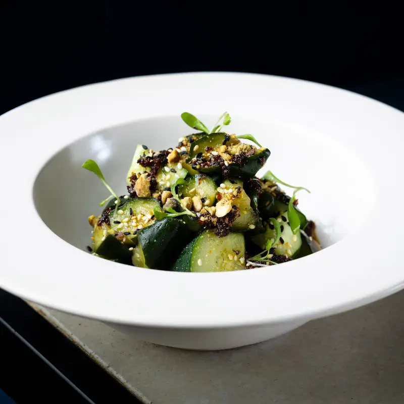 Pepino em conserva levemente agridoce e óleo de gergelim