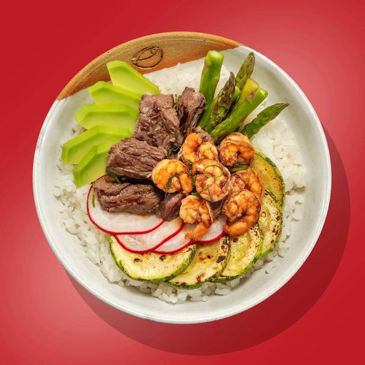Uma fusão irresistível entre o Havaí e a parrilla! Fatias suculentas de fraldinha grelhada no ponto perfeito junto a camarões também grelhados. Ambos, servidos sobre uma base fresca de arroz japonês .Acompanhados de ingredientes vibrantes como avocato, aspargos, abobrinha e rabanetes fatiados com tempero agridoce para equilibrar