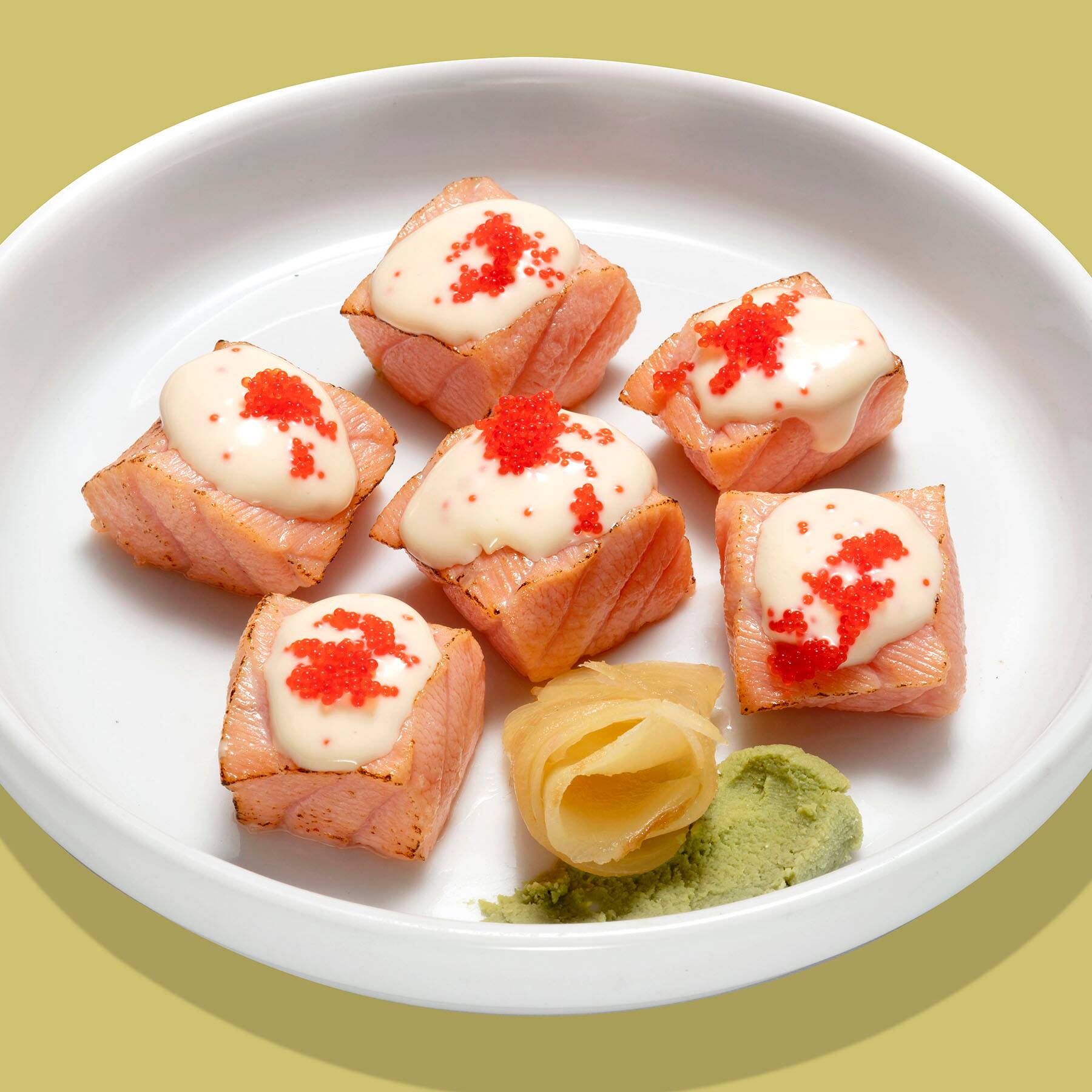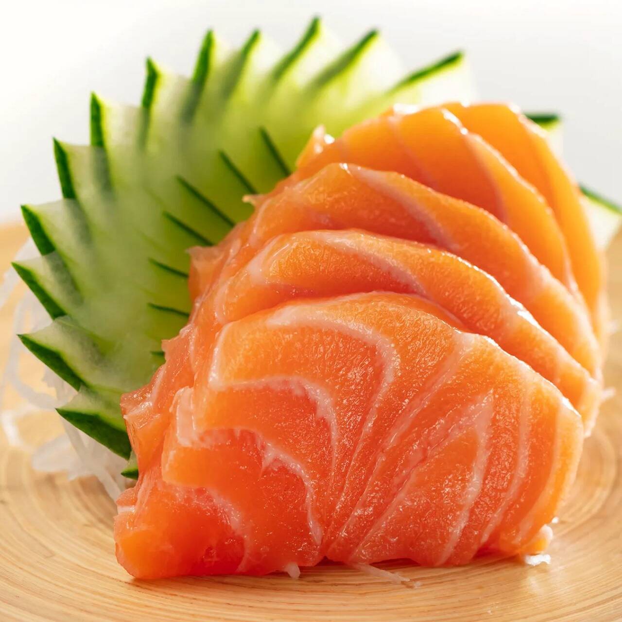 Fatias de salmão, acompanha gengibre e wasabi. Porção 6 unidades.
