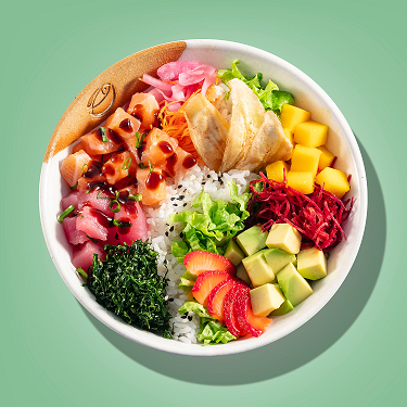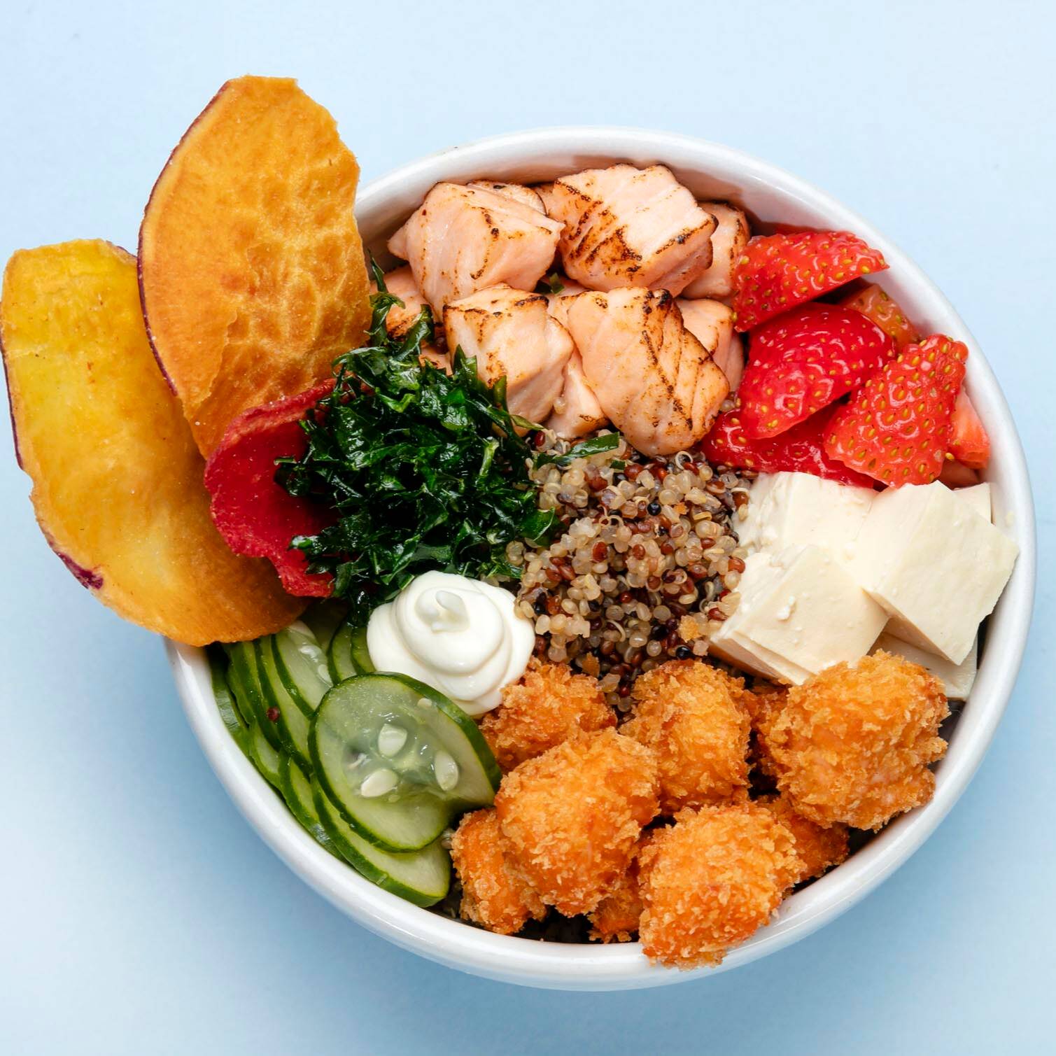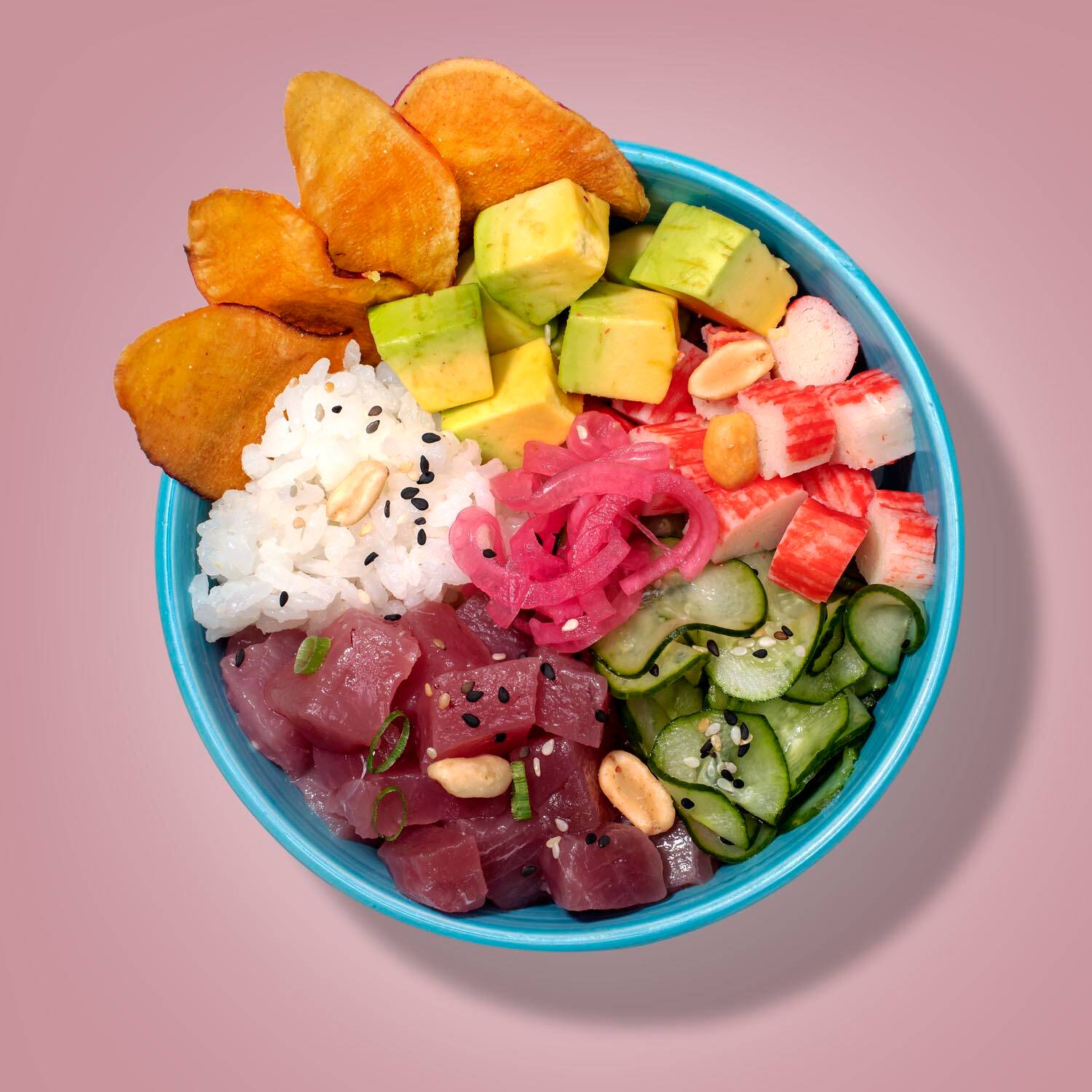 Um dos pokes mais pedidos pela variedade de sabores. Quinoa, atum, salmão, kani, pepino temperado, manga, abacate e chips de batata doce molho à sua escolha.