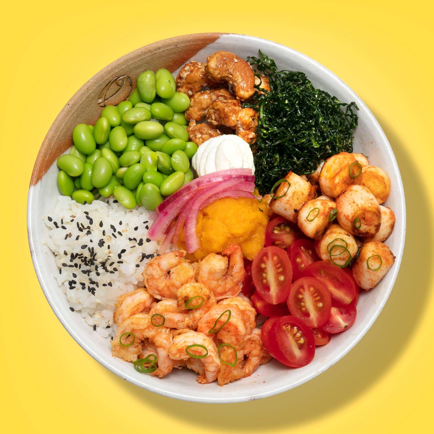 Poke frutos do mar ?Saboroso Mix de Camarão e botões de lula, com opção de refogar ou empanar, acompanhado de arroz branco (shari), purê de abóbora, tomate cereja, edamame (grãos de soja verde), crispy de couve e nossa deliciosa castanha de caju caramelizada. Finalizado com decoração de cream cheese.