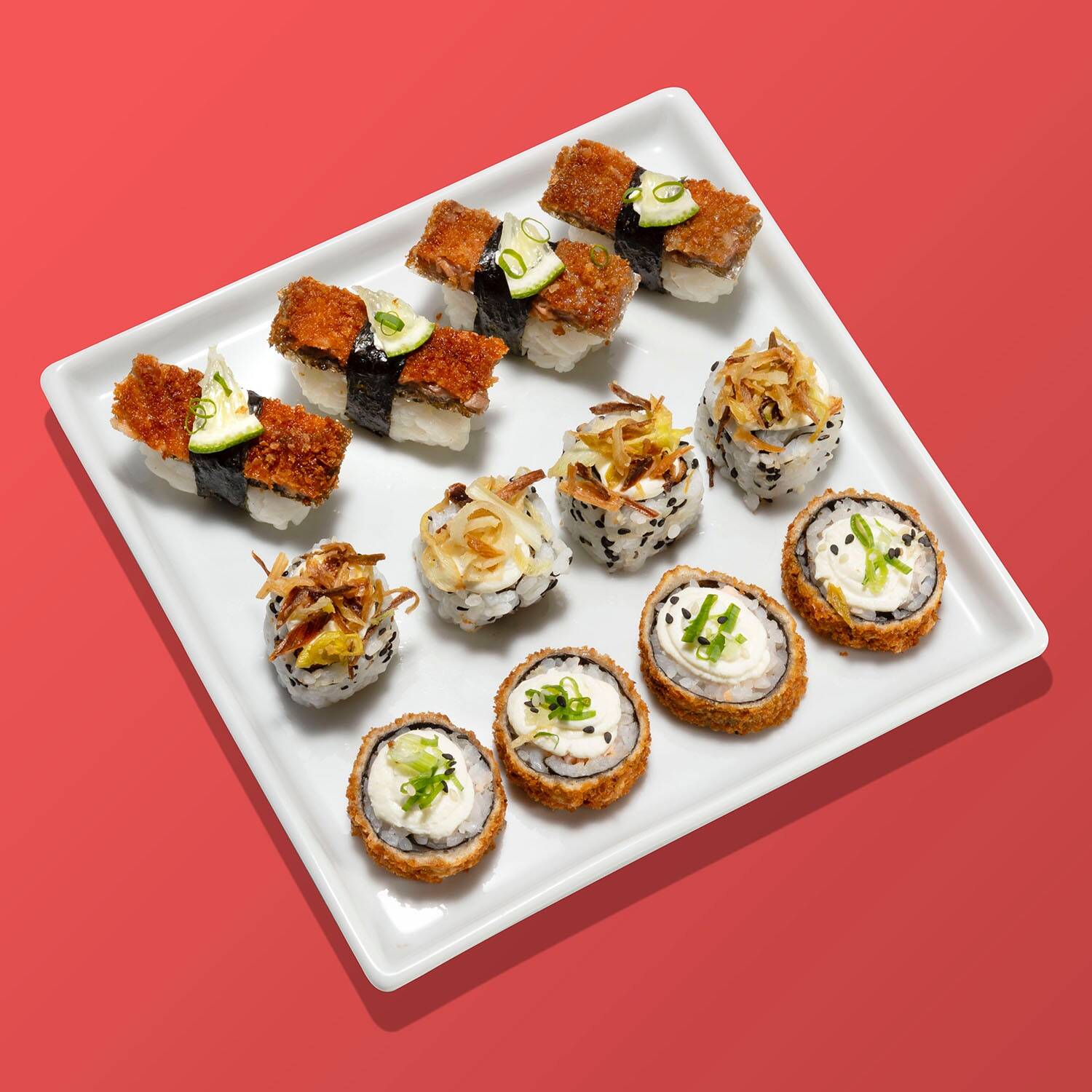 Escolha: 4 Sushis (Baterá ou Niguiri), 4 Sashimis, 4 Joes, 4 Rolls e 4 Hossomakis