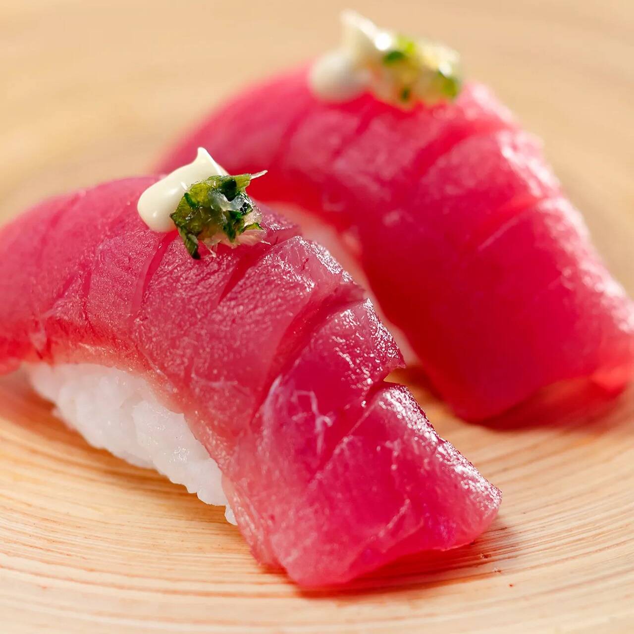 Arroz, atum, gengibre e wasabi. Porção com 6 unidades.