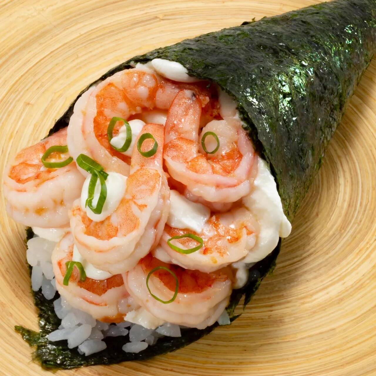 Arroz, camarão grelhado, cream cheese, nori e cebolinha.