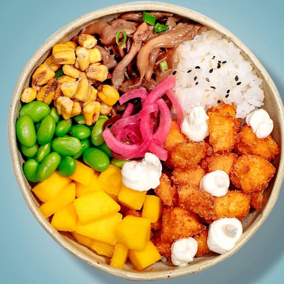 Uma combinação deliciosa e aconchegante para os dias frios! Feito com arroz gohan quentinho como base, salmão empanado crocante, shimeji salteado, edamame, manga fresca, cream cheese cremoso, milho crocante mostarda e mel, com o molho de sua preferência. Uma explosão de sabores quentes e frios em perfeita harmonia!