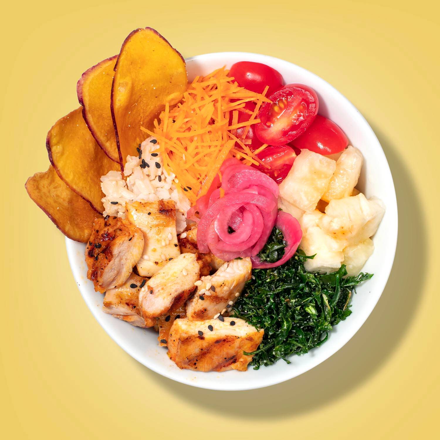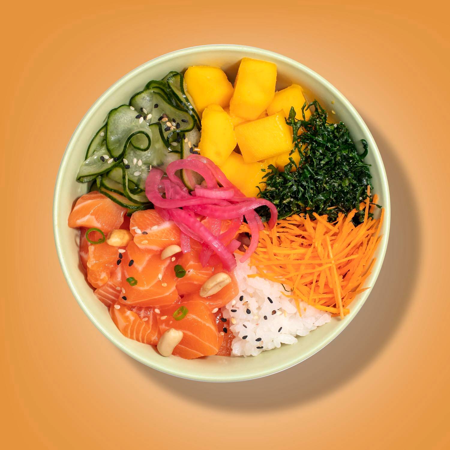 “Um poke havaiano com toque japonês: base de arroz japonês, salmão temperado com cream cheese, castanha de caju crocante, guacamole cremosa, abacaxi, tomate-cereja fresco e chips de banana salgada para dar textura e brasilidade.”