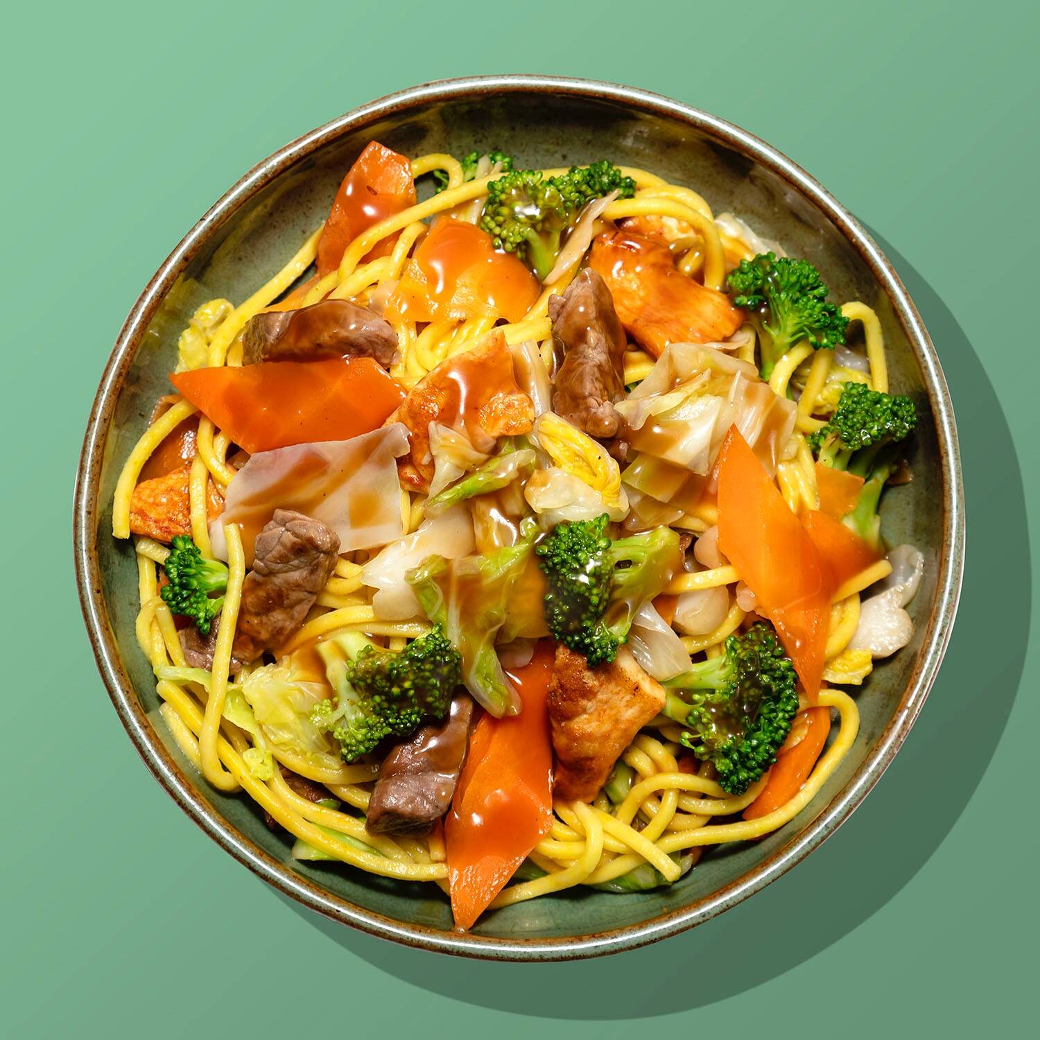 Uma deliciosa combinação de macarrão oriental salteado com cubos suculentos de carne bovina, frango grelhado, frutos do mar (camarão grelhado e lula grelhada) e opção vegetariano (shimeji), acompanhadas de legumes frescos como cenoura, brócolis, repolho e acelga. Tudo envolvido em um molho especial à base de shoyu, levemente adocicado e cheio de sabor. Uma refeição completa, equilibrada e irresist