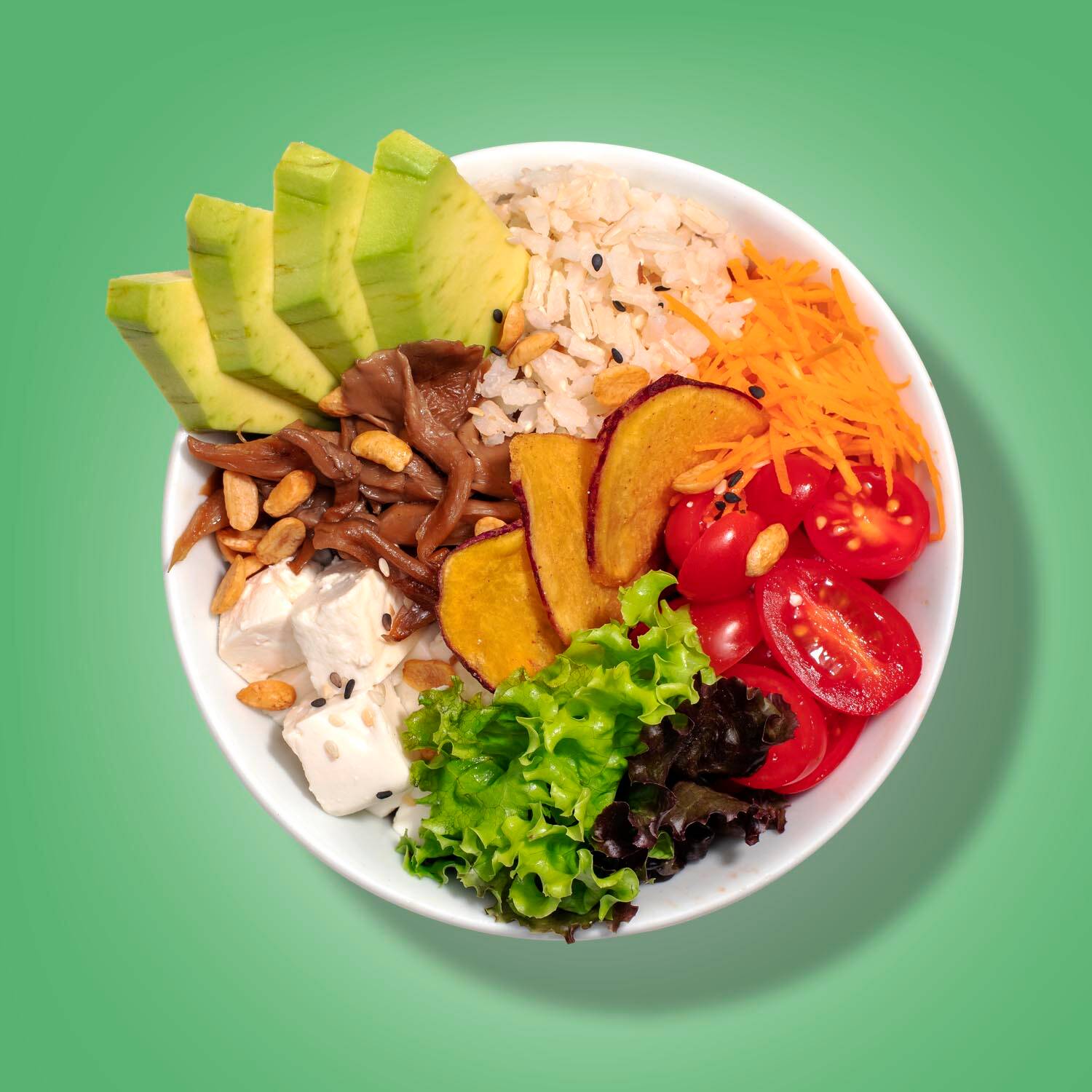 Shimeji e Tofu Acompanha arroz branco ou integral, abacate, tomate cereja, alface crespa, chips de batata doce.