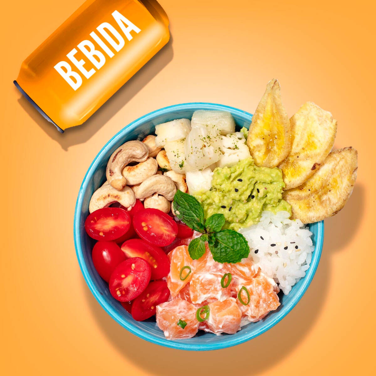 “Um poke havaiano com toque japonês: base de arroz japonês, salmão temperado com cream cheese, castanha de caju crocante, guacamole cremosa, abacaxi, tomate-cereja fresco e chips de banana salgada para dar textura e brasilidade.”