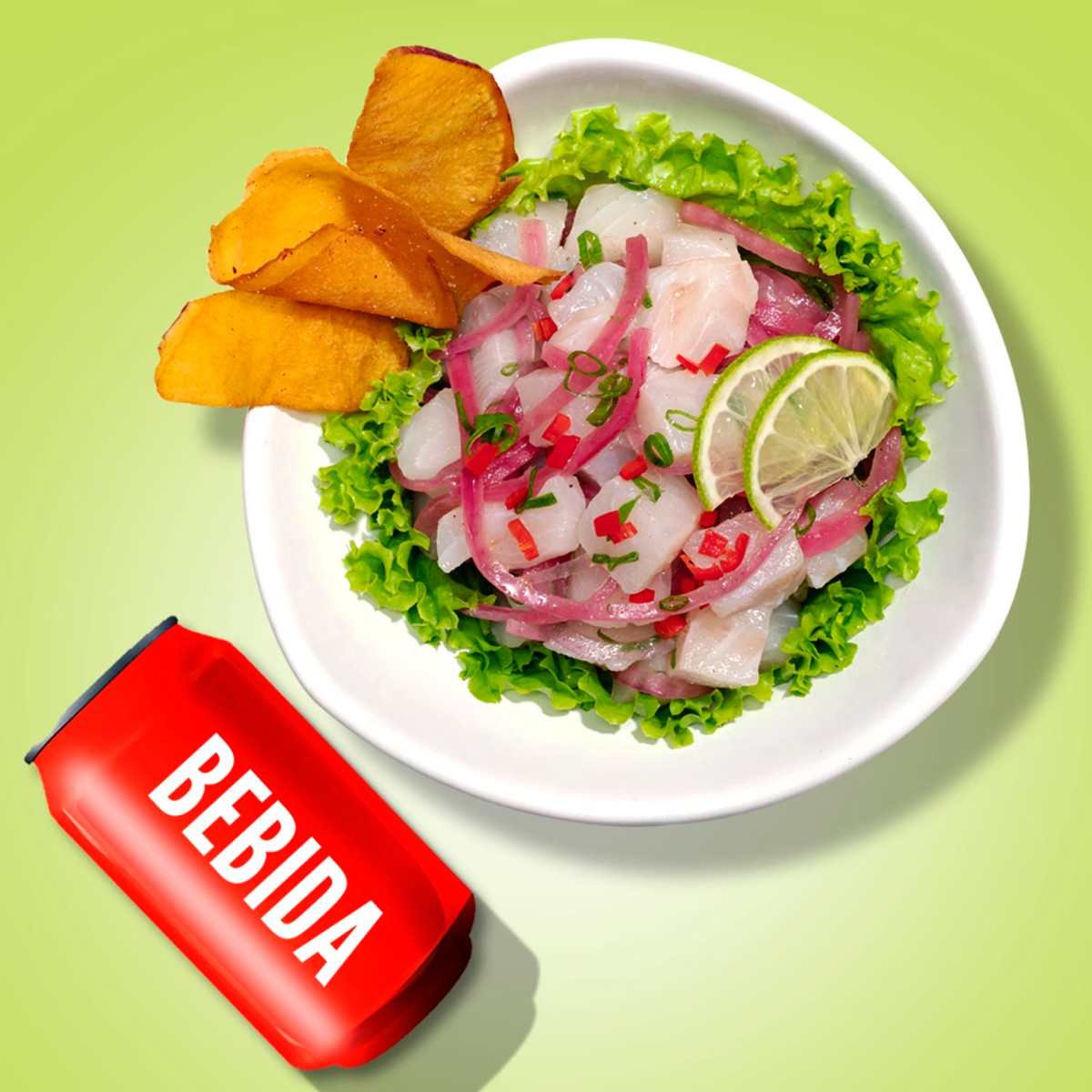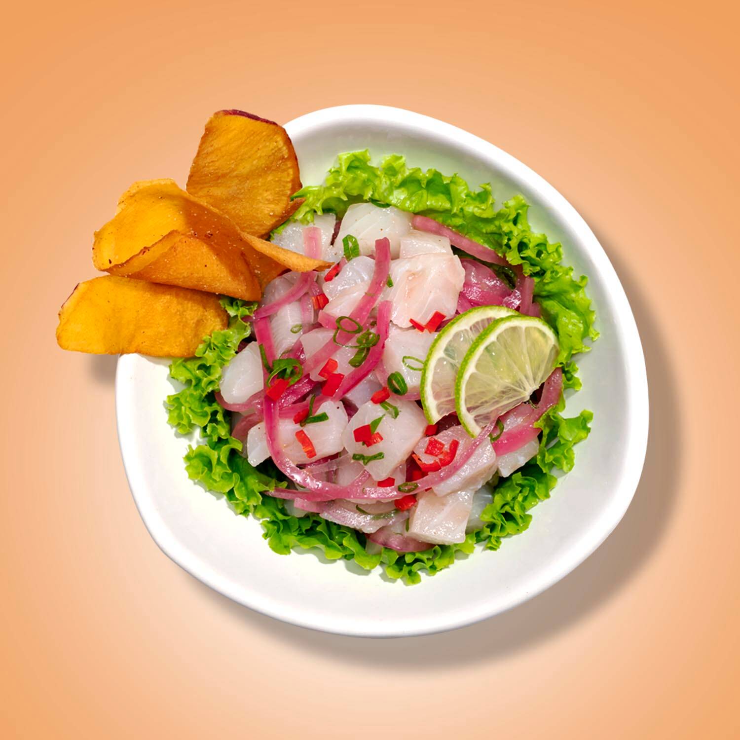 Escolha sua opção: Peixe branco, Mix de Peixes ou Salmão, cebola roxa, pimenta, cebolinha, sumo de limão e laranja, sal, azeite. Acompanha chips de batata doce, chips de banana salgada ou chips de mandioquinha.