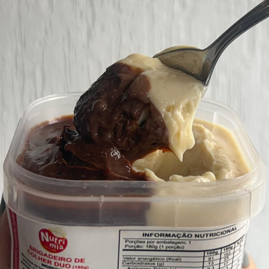 Quer um docinho delicioso e mais saudável? Os docinhos Nutrimia são a escolha perfeita! O brigadeiro de colher tradicional não leva açúcar refinado e é feito com apenas 4 ingredientes: biomassa de banana verde, iogurte desnatado, cacau 100% e mel. Porção de 180g: apenas 136 kcal. Peça e se delicie! 🍫✨