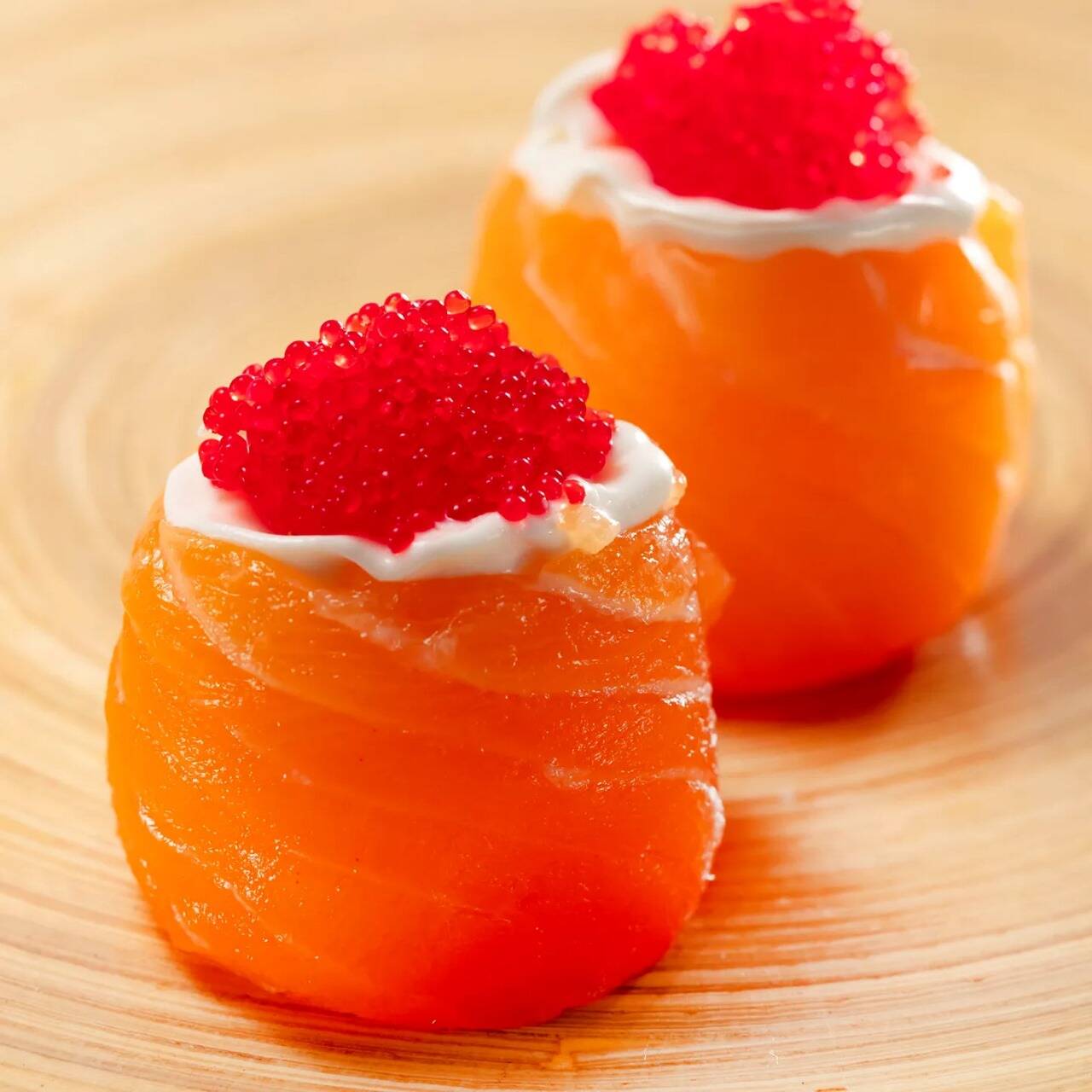 Arroz envolvido no salmão com cream cheese e ovas de tobiko.
