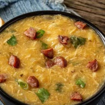 Uma sopa leve e saborosa, preparada com pedaços tenros de frango e uma seleção de legumes frescos, como cenoura, batata, e outros legumes. O caldo, suave e nutritivo, envolve os ingredientes de forma deliciosa, criando uma refeição acolhedora e reconfortante. Ideal para aquecer o corpo em dias mais frios ou para uma refeição saudável, essa sopa combina o sabor delicado do frango com a frescor dos legumes, proporcionando um prato nutritivo e cheio de sabor.