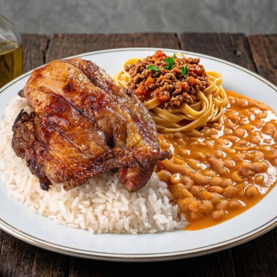 Arroz caseiro, feijão fresquinho com Macarrão envolvido em molho bolonhesa encorpado com carne bem temperada, acompanhado de sobrecoxa assada dourada, suculenta e cheia de sabor. Combinação farta e irresistível.