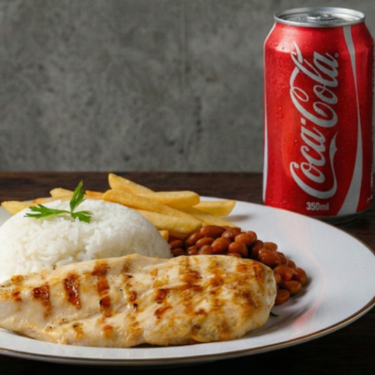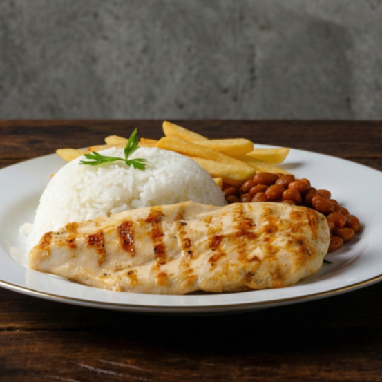 Filé de frango grelhado, suculento e saboroso, servido com arroz, feijão e batatas fritas crocantes. Uma combinação leve e cheia de sabor!