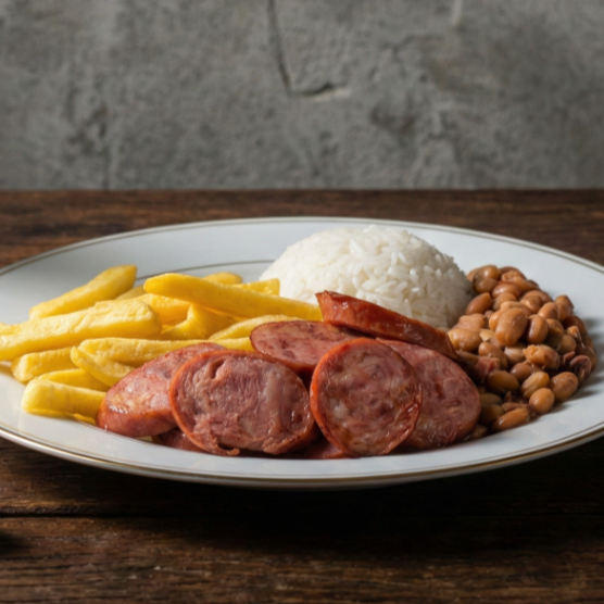 Linguiça toscana grelhada na medida certa, suculenta e cheia de sabor. Acompanha arroz branco soltinho, fritas crocantes e feijão bem temperado.