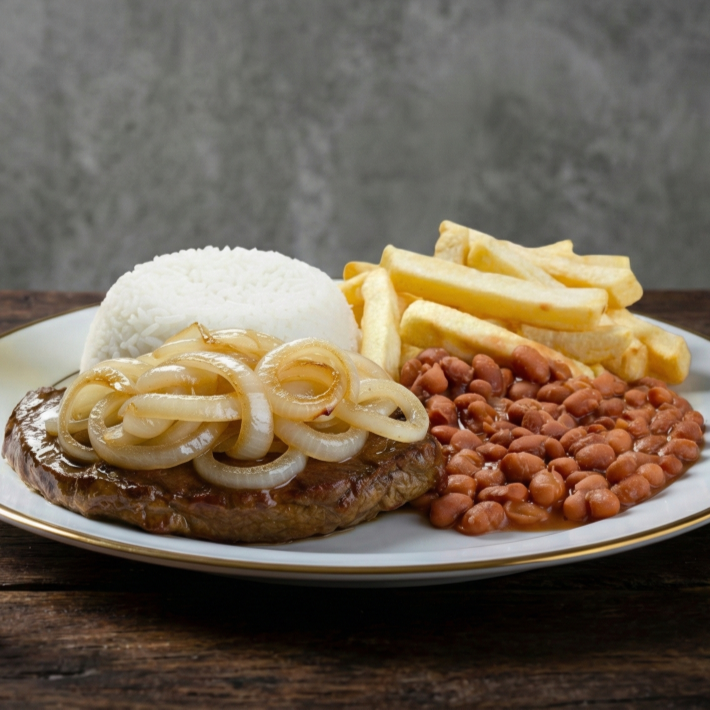 Bife grelhado suculento, coroado com cebolas caramelizadas que derretem na boca. Acompanha arroz, feijão e batatas fritas crocantes para completar o sabor!