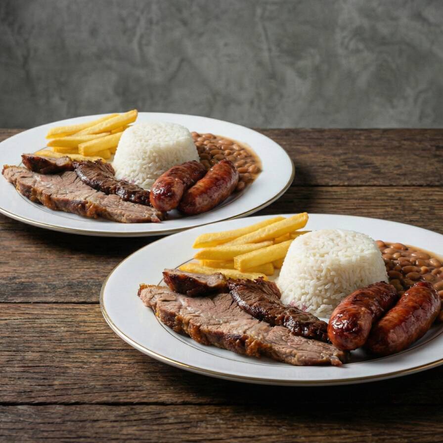 Contra filé grelhado no ponto, junto com linguiça toscana, arroz, feijão caseiro e fritas.