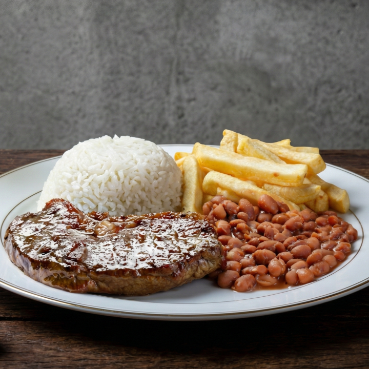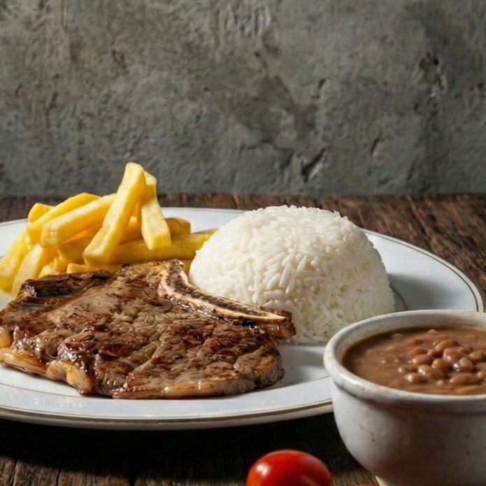 Bisteca suculenta grelhada com perfeição, acompanhada de arroz branco soltinho, fritas crocantes e feijão cheio de sabor. Um prato que satisfaz!
