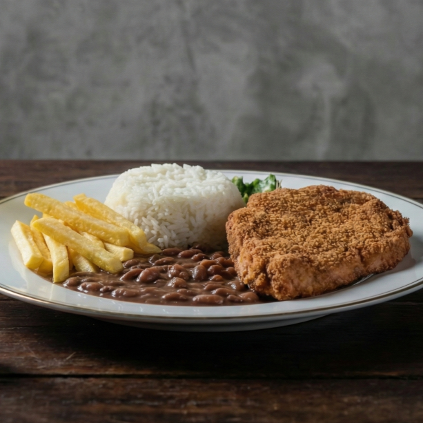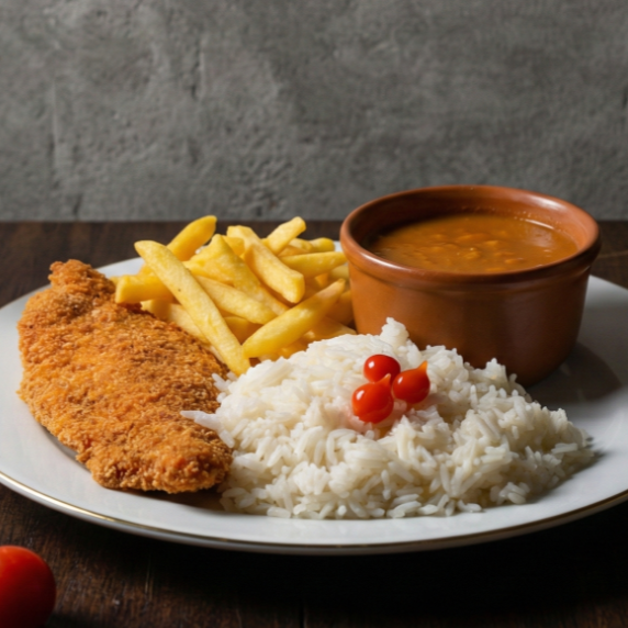 Filé de frango empanado, crocante por fora e macio por dentro, acompanhado de arroz, feijão e batatas fritas douradinhas. Uma combinação clássica que encanta!