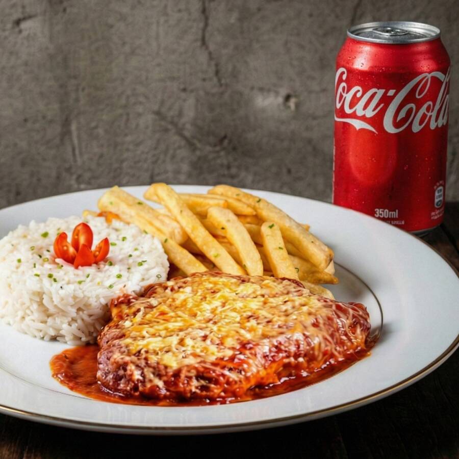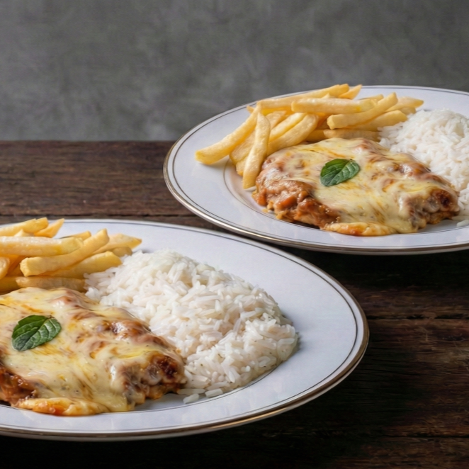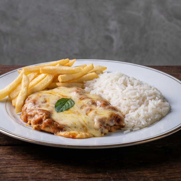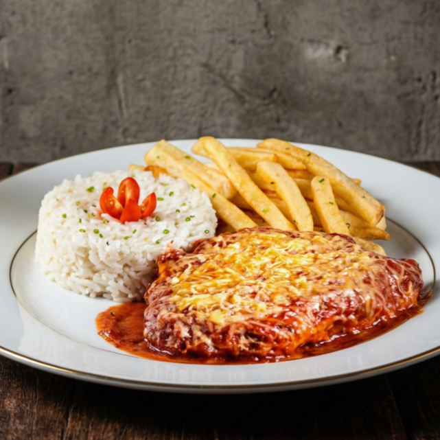 Contra filé empanado, coberto com molho de tomate caseiro e queijo derretido, servido com arroz soltinho e batatas fritas crocantes. Um clássico que conquista todos os paladares!
