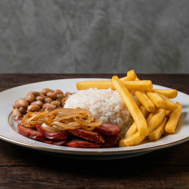 Calabresa suculenta e dourada, acompanhada de cebolas caramelizadas e batatas fritas crocantes. Servida com arroz e feijão, é sabor que não decepciona!