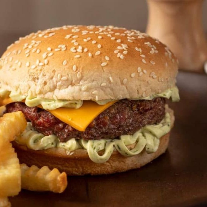 Pão, hambúrguer artesanal de 120g, queijo cheddar e maionese verde temperada.