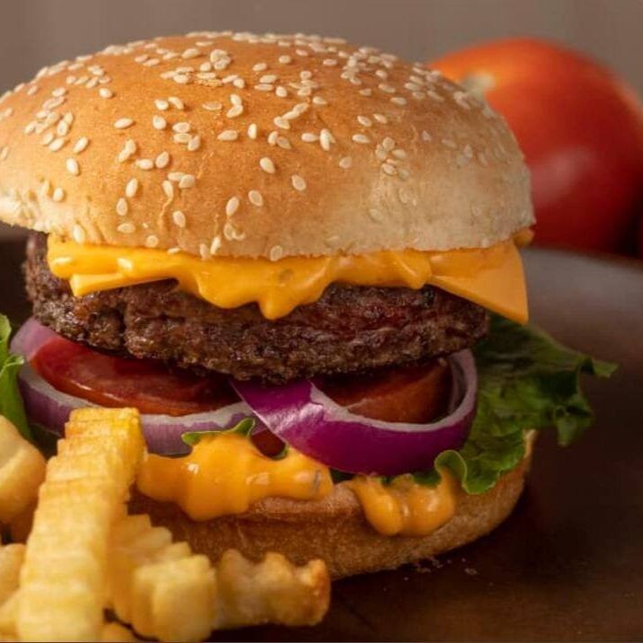 Pão com Gergelim, hambúrguer artesanal de 120g, queijo cheddar, alface americano, tomate, cebola roxa, picles e molho especial.