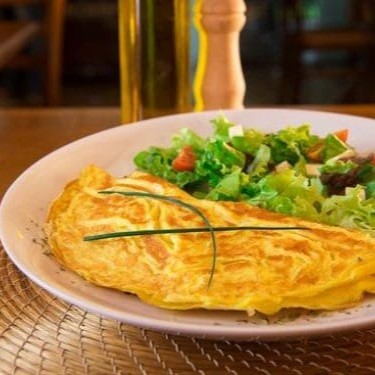 Farto Omelete com 3 ovos, presunto, queijo, cebola e tomate acompanhado com uma super salada de folhas verdes, cenoura e tomate.