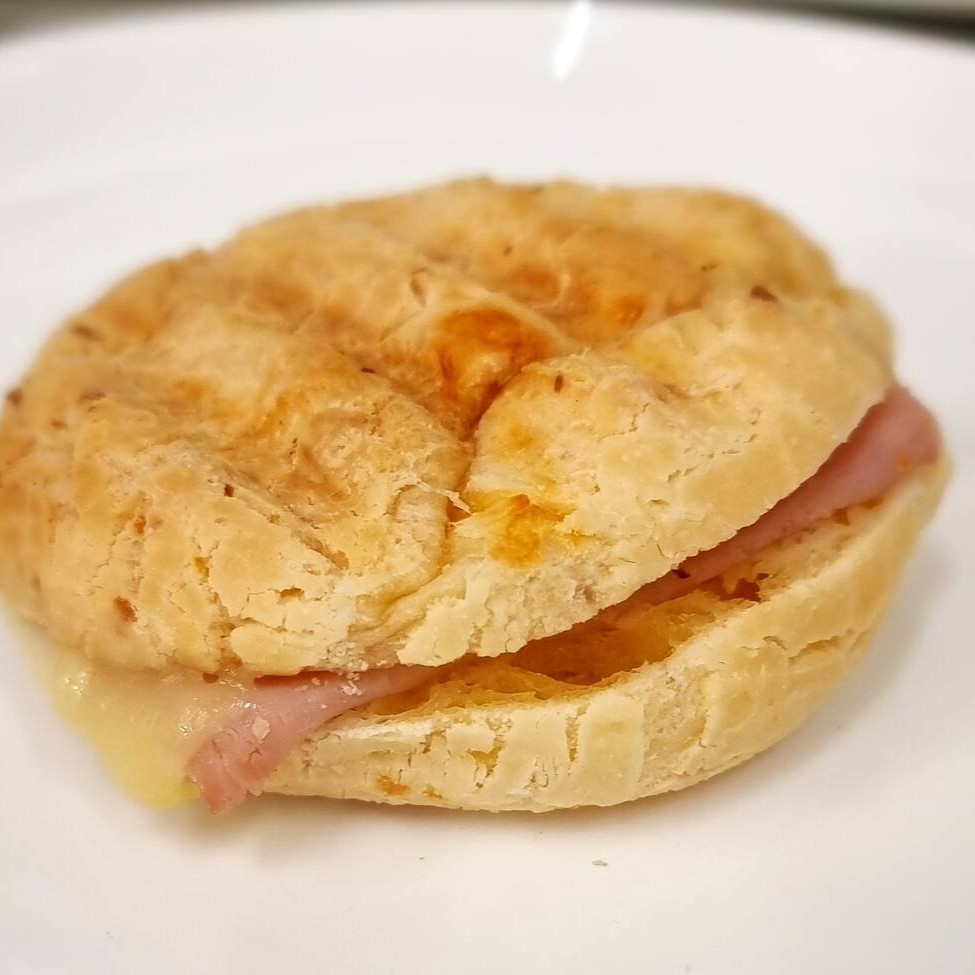 Delicioso Pão de Queijo, recheado com presunto e queijo. Tudo isso é cuidadosamente tostado, resultando em uma crocância incrível que complementa a suavidade do interior.