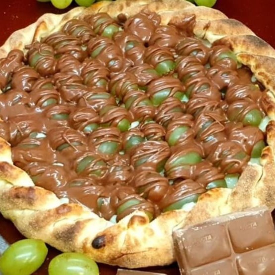 Massa tradicional recheada com creme de leitinho, Uva verde sem semente, cobertas com uma camada de chocolate ao leite - Pizza broto (6 Fatias)