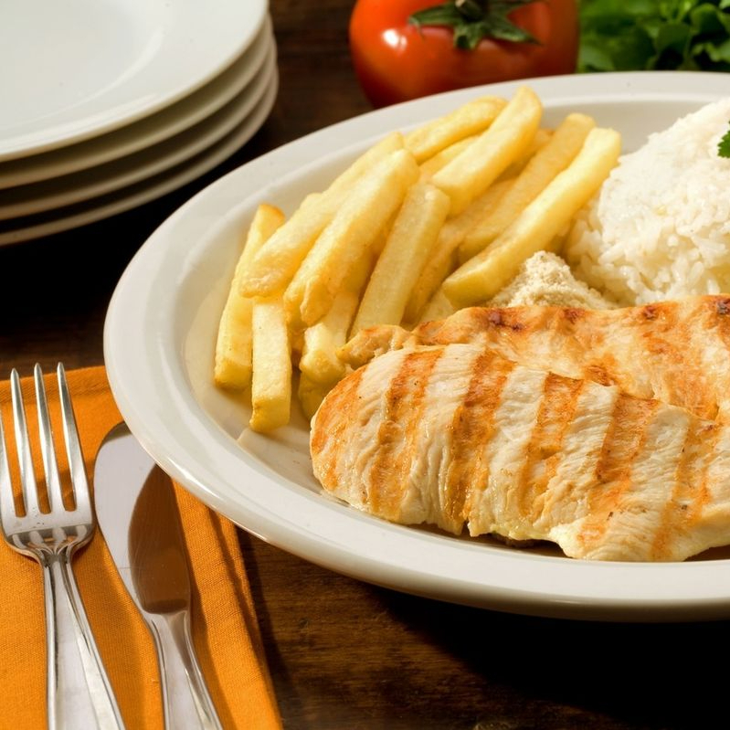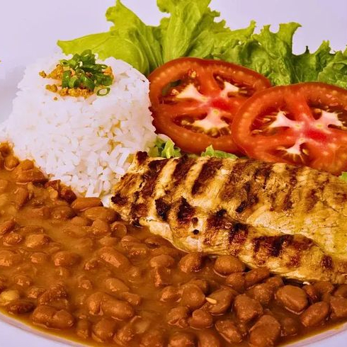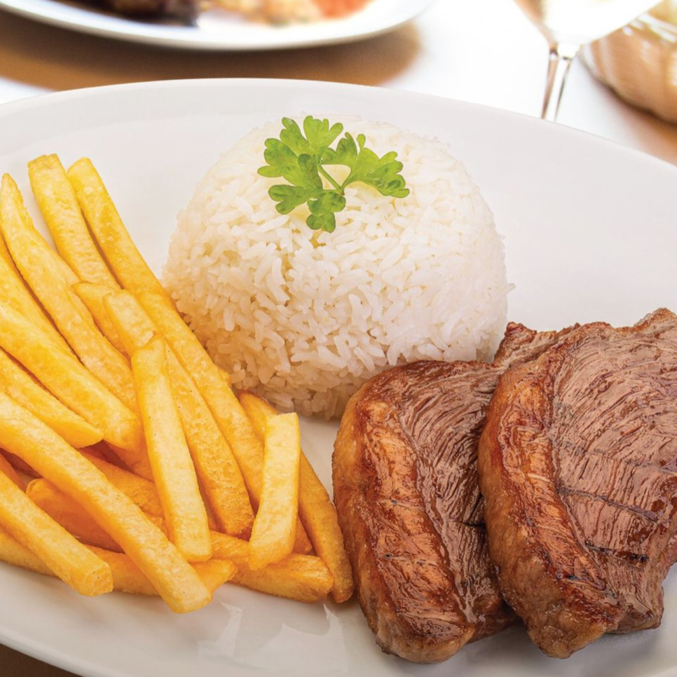 Arroz,feijão,contra-file com alho,refogado,farofa e fritas