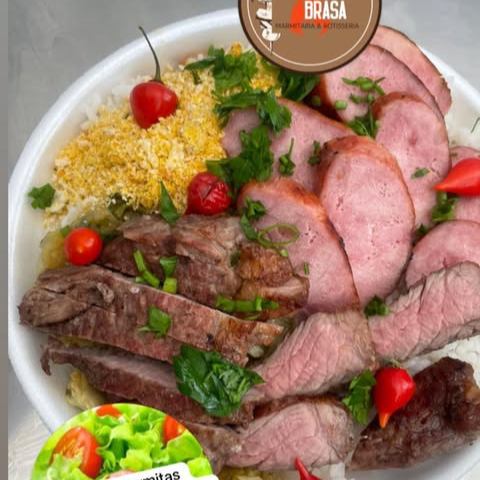 Arroz,feijao,farofa,fraldinha e linguiça assada,vinagrete e maionese