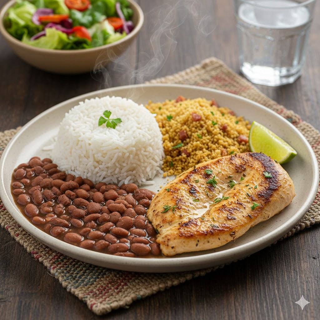 Arroz,feijão,farofa,contra preparado na churrasqueira com queijo