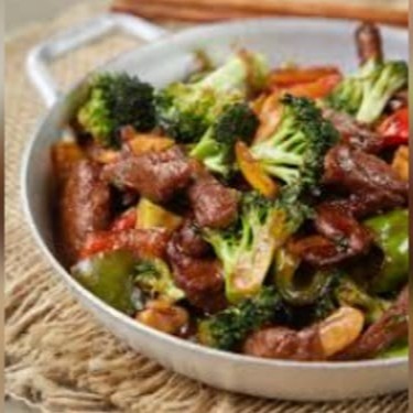 Carne em tiras brócolis, champignon, pimentão, alho, temperado com molho de soja.