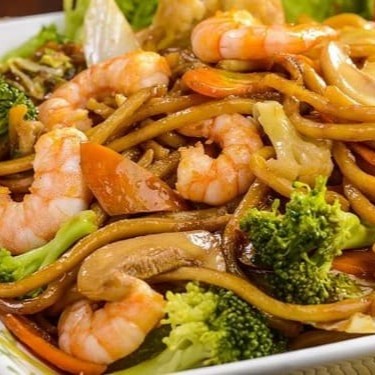 Saboroso macarrão com camarões selecionados, acompanhado de brócolis, couve-flor, cenoura e acelga, e finalizado com champignon. Uma combinação perfeita de frutos do mar e vegetais frescos para uma refeição leve e deliciosa.