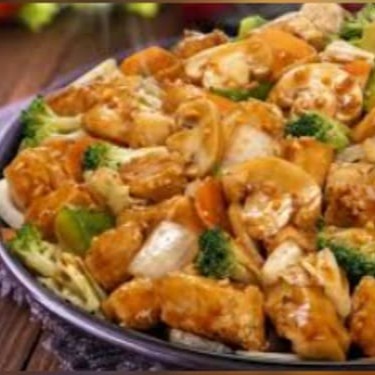 Cubos de frango, brócolis, champignon, alho, temperados com molho de soja. Box executivo acompanha metade do box com prato escolhido e metade Yakimeshi (arroz com flocos de ovos, cenoura, presunto e cebolinha).
