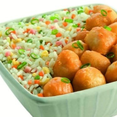 Arroz, carnes em tiras, cenoura, ervilha, flocos de ovos, temperados com molho de soja.