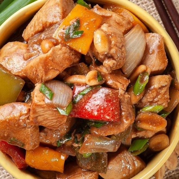 Um prato irresistível que combina cubos de frango suculentos, cebolas caramelizadas, pimentões vibrantes e amendoins crocantes. Uma harmonia de sabores e texturas que transforma cada garfada em pura satisfação.