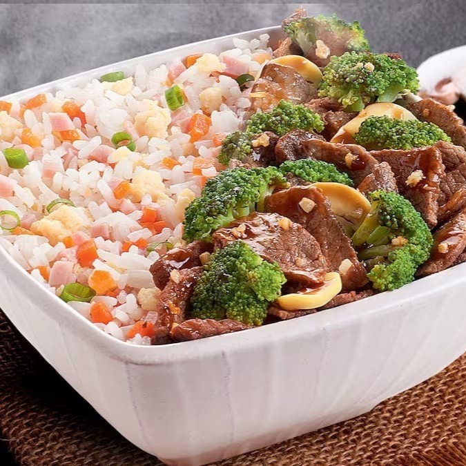 Carne em tiras brócolis, champignon, pimentão, alho, temperado com molho de soja. Box executivo acompanha metade do box com prato escolhido e metade Yakimeshi (arroz com flocos de ovos, cenoura, presunto e cebolinha).