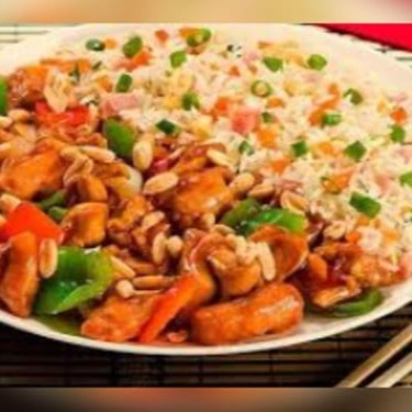 Deliciosos cubos de frango, cebola, pimentão verde e vermelho e amendoim. Box executivo acompanha metade do box com prato escolhido e metade Yakimeshi (arroz com flocos de ovos, cenoura, presunto e cebolinha).